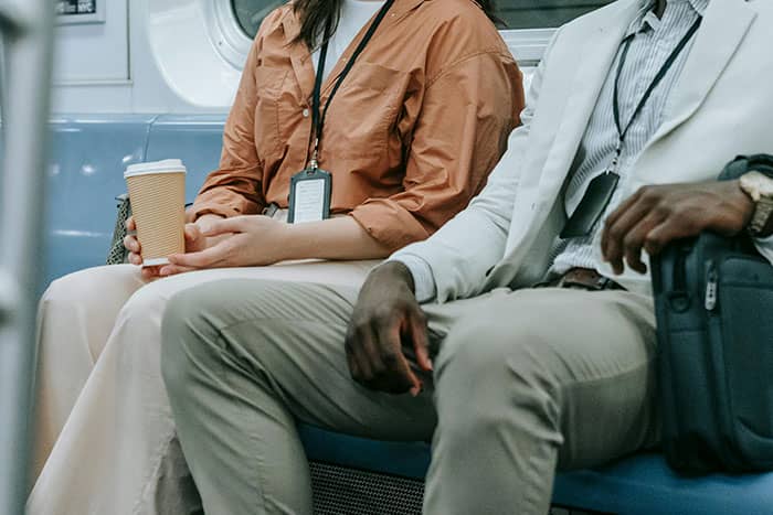 I cross my legs so he’s risking getting his trousers’ leg dirty by the bottom of my shoe if he man spreads. Works very well on the ones with suits/work attire on 🙂