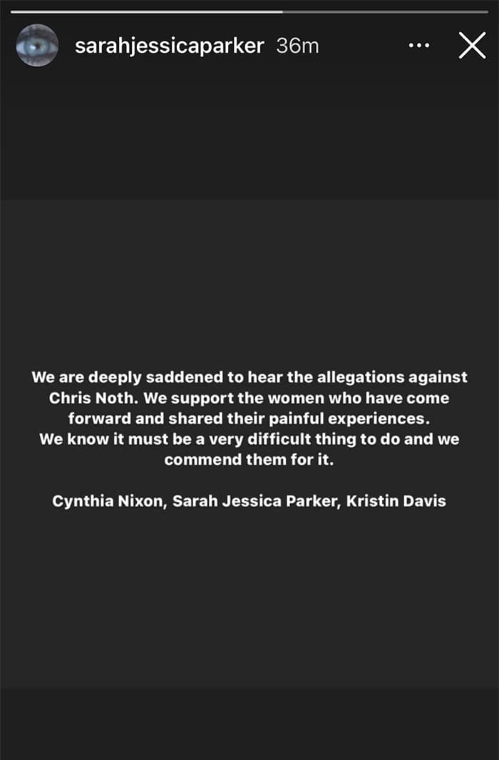 The actress, alongside fellow S*x and the City stars Cynthia Nixon and Kristin Davis, released a statement saying, “We are deeply saddened to hear the allegations against Chris Noth. We support the women who have come forward and shared their painful experiences.”