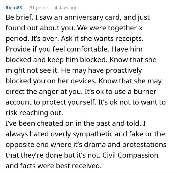 Experts caution that finding out about your partner’s affair can be emotionally devastating and cause so much trauma that it may lead to Post-Infidelity Stress Disorder. In fact, between 30% to 60% of people who were cheated on have experienced this. Now we know why OP was hesitating so much about exposing the man in front of his wife.