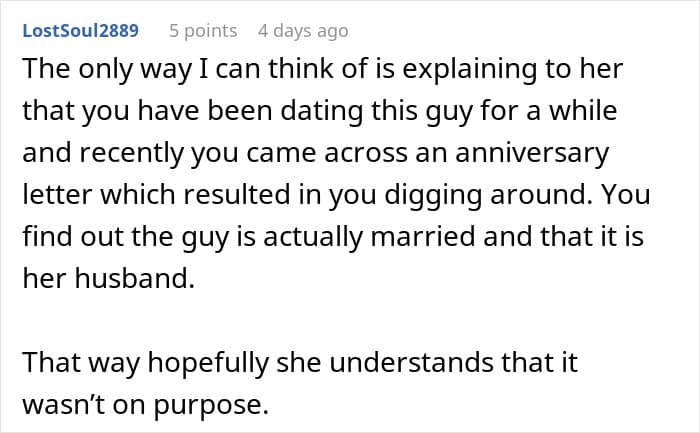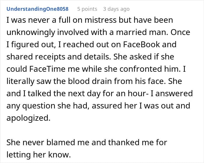 The bigger problem that was bothering her was whether she should expose him in front of his wife or not. Obviously, finding out such a huge lie about her husband might break her heart, so OP was skeptical about it. Besides, she also felt that his wife might take out all her anger on her, even though she was not at fault in this situation, so she vented online.