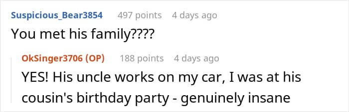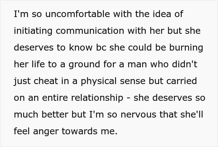 Now, OP would never have dated him in the first place had she known the truth. However, what really horrified her was the scale of this “affair,” because both of their families were involved with each other. She just couldn’t fathom how a guy could bring his relatives into his infidelity and then lie for so many years without feeling any remorse at all.
