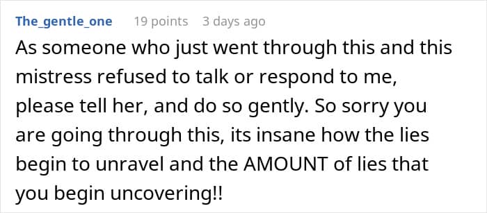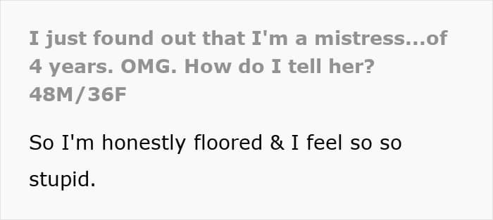 However, netizens said that the woman had a right to know, and no matter what, the poster should do it. Our heart also goes out to her because even she must be heartbroken to find out that she was his mistress all along. OP also revealed that the guy had been married many times and was deeply in arrears for child support.