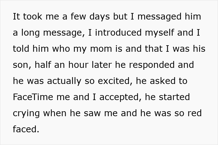 Years later, OP’s curiosity finally won, thanks to a random TikTok post giving it a nudge over the line. After getting a name from his mom, a little time on Facebook did the rest. There he was… an older mirror image of OP, a lawyer, married with four kids. A nervous message led to a reply, FaceTime tears, and then a shocking revelation.