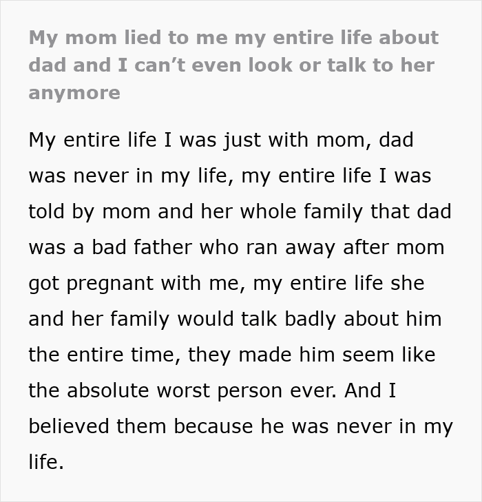 One guy turned to an online community to vent after discovering his mom had lied to him for his whole life about his dad running out on her while she was pregnant. After getting his name out of her, he tracked the man down, and even more was revealed.