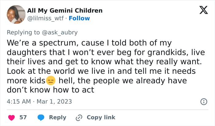 This deluded mom in this story was definitely not on board with her daughter’s decision because she felt “those souls needing to come into [their] family for ancestral or karmic reasons still [needed] to be born.” Although most folks probably don’t share such an extreme opinion, religion, culture, and mindset do play a role in people’s attitudes toward child-free individuals.