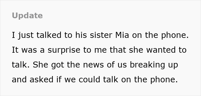 The man was also annoyed that his sister had talked to his ex, and despite the long conversation he had with the poster, he still sided with his family