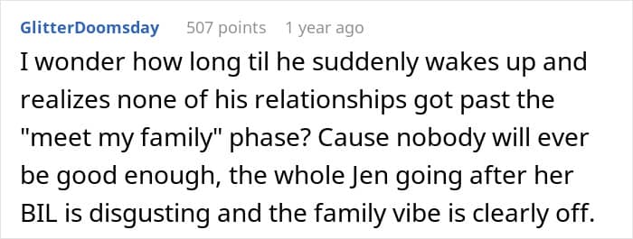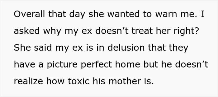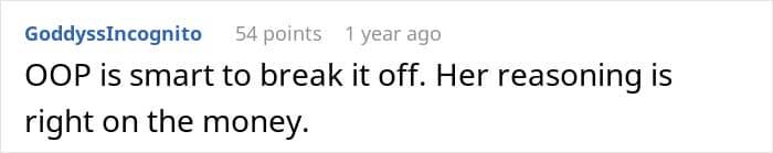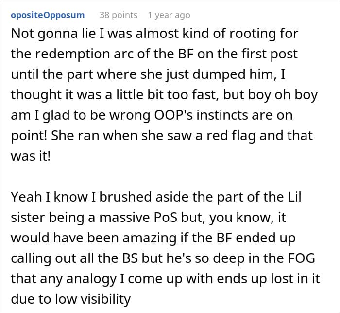 Through the entire conversation, the poster also realized how much her ex-partner’s family had controlled his sister’s entire life. That’s why she was glad that she had made the tough decision to break things off before they got married, and she was in too deep.