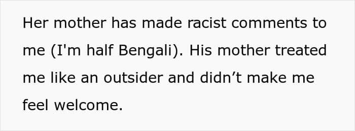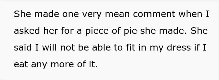 When the woman first met her fiancé’s family, she was shocked at how mean and controlling they seemed to be. This was mainly due to the man’s mother’s possessiveness and how irritated she seemed whenever the OP got close to her son. Apart from that, she also fat-shamed the young woman, separated the couple, and kept insulting her own daughter.