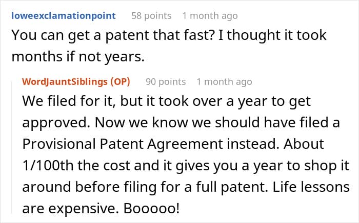 In the comments, readers were surprised the guy got a patent as quickly as he did, and even responded with their own complaints against big brands