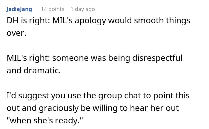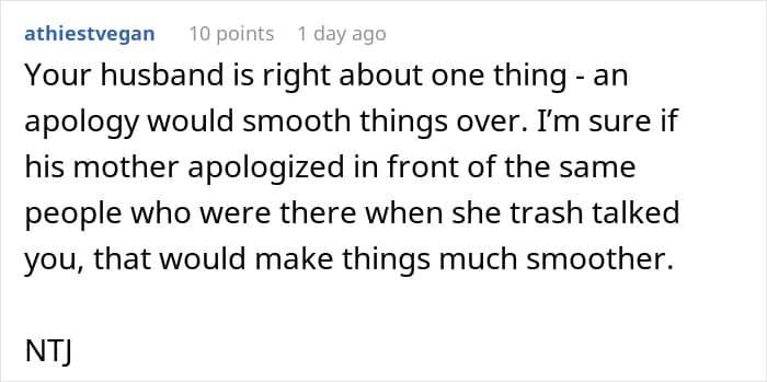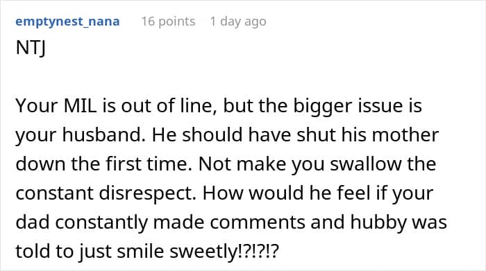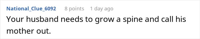 Most people said she’s not the jerk in the situation (NTJ) and criticized her husband for siding with his mother