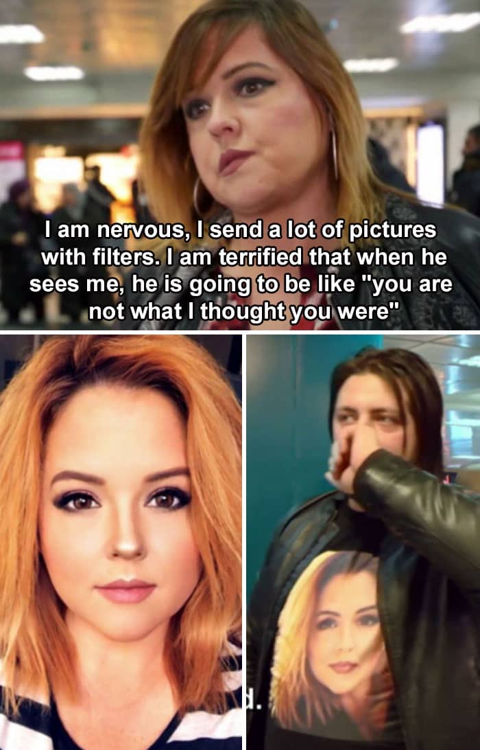 #1 Woman Worries As She Meets Her Fiance Abroad At The Airport For First Time After Communicating Through Heavily Filtered Photos And Videos Of Herself. (He Of Course Shows Up To Meet Her Wearing A Heavily Filtered Photo Her On His T-Shirt…)