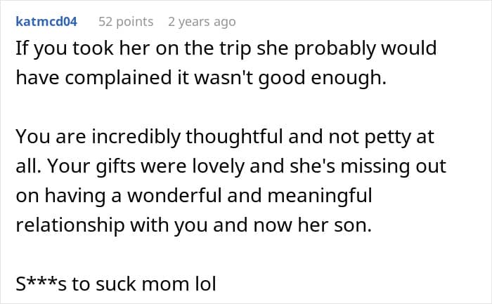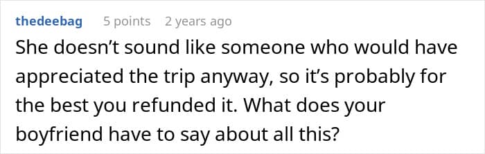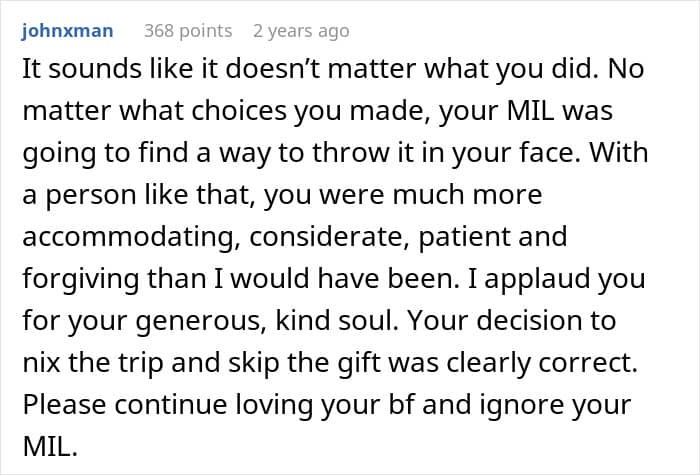 A man shared how he finally got back at his rather rude partner’s mom when she kept insulting him. He planned out a lovely trip for them all, when he learned how she was talking about him in private. Well, no trip for her. We reached out to the man who made the post via private message and will update the article when he gets back to us.