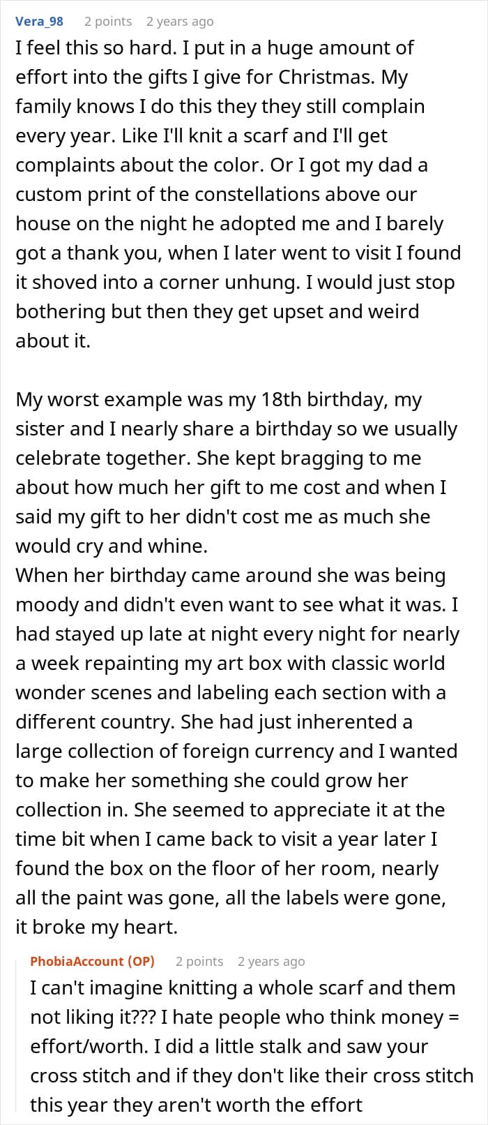 The internet has a weakness for revenge stories, and few scratch that particular itch quite like the tale of a man who spent three years and hundreds of dollars trying to win over his boyfriend’s mother, only to finally give up and watch her melt down when she realized she wasn’t getting a Christmas gift. For two years, he bought thoughtful presents that she either threw away or regifted. A $100 necklace in her favorite color? Given to her niece. Custom-scented candles evoking their shared hometown? Handed off to her sister. When he planned a $2000 trip to that hometown as a birthday and Christmas gift, she told him not to bother with “tacky little trinkets from Target.” So he canceled it, bought his boyfriend Lego instead, and showed up to Christmas with gifts for everyone except her. She threw food on the floor and has been calling him nonstop ever since. His response? He’s having “a genuinely fun time answering her calls lately” and looking forward to the next family gathering.