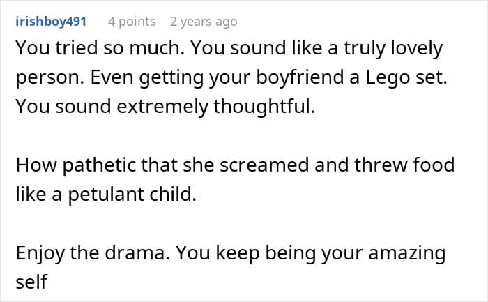The truth is that petty revenge stories satisfy something primal in us, the need to see patterns of bad behavior corrected, to watch people learn that actions have consequences, and to witness someone finally stop setting themselves on fire to keep someone else warm. We’re not celebrating cruelty, we’re celebrating boundaries. And if those boundaries come with a side of schadenfreude and some dramatic food-throwing, well, that just makes the story better. The boyfriend’s mother will survive not getting a Christmas present, but she might finally learn that you can’t treat people terribly and still expect their effort.
