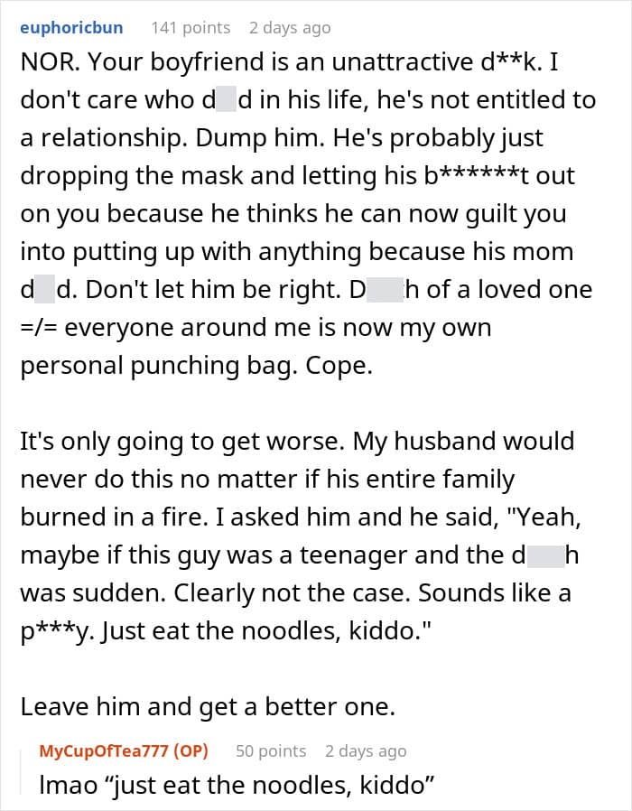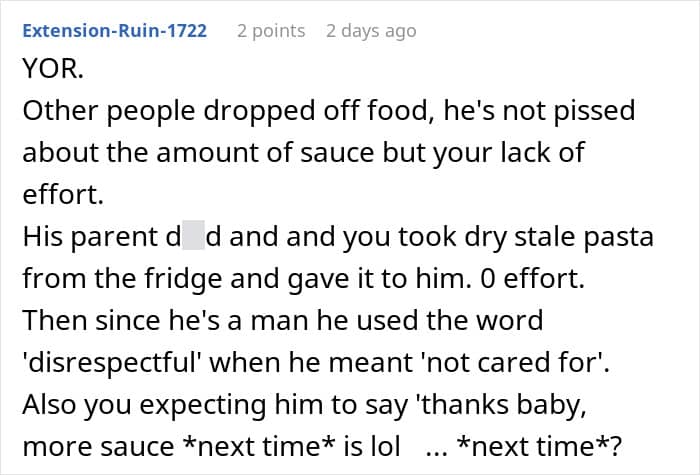 When Reddit user MyCupOfTea777 got the tragic news that her boyfriend’s mom had passed away, she was ready to be there for him in any way he needed. One of the things she did was bring over a pot of pasta and meatballs she had cooked.