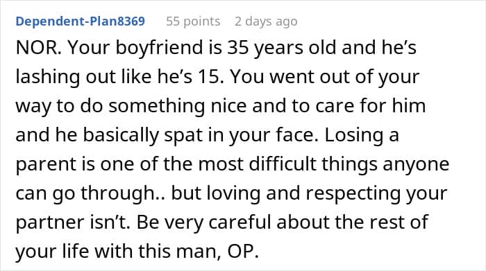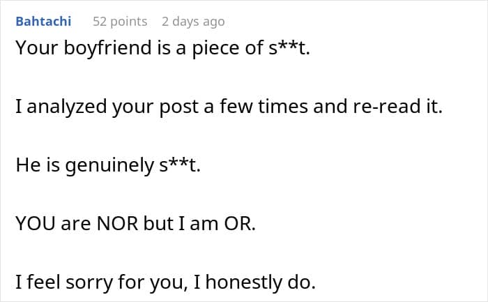 Most people who read the story said the woman was not overreacting (NOR) and thought her boyfriend’s behavior was unacceptable