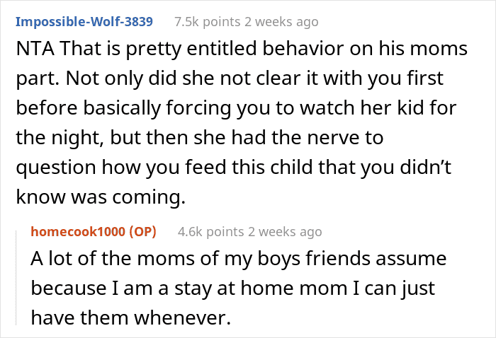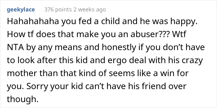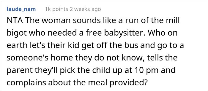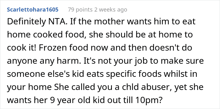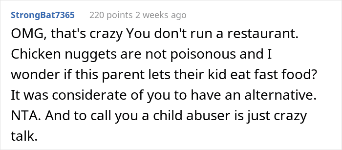 And it’s not like the kid wasn’t happy with the nuggets and fries (seriously, who can say ‘no’ to a classic combo like that?), it was his mom who had the issue. She thought that free childcare without notice wasn’t good enough—her precious baby boy needed a bespoke homecooked meal. What she called ‘child abuse’ really was just practicality and common sense. The vast majority of the AITA community members who read the post were confused about the picky eater’s mom’s over-the-top reaction.
