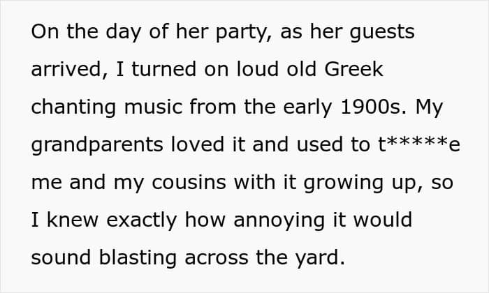 This family had exactly that kind of neighbor, yet the man found a way to deal with the entitled neighbor in a particularly petty way. Because her thing was filing complaints about the most absurd things, he decided to turn the town code against her and treat her to a party with some 1900s Greek chanting music. And he did it in a way that’s legal.