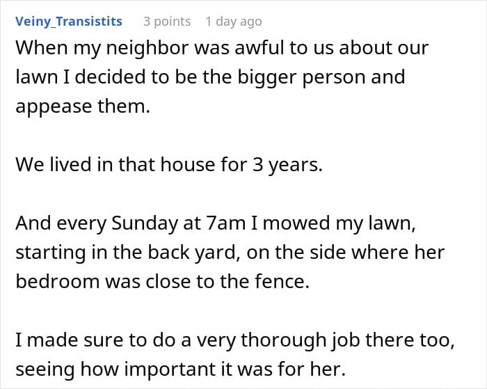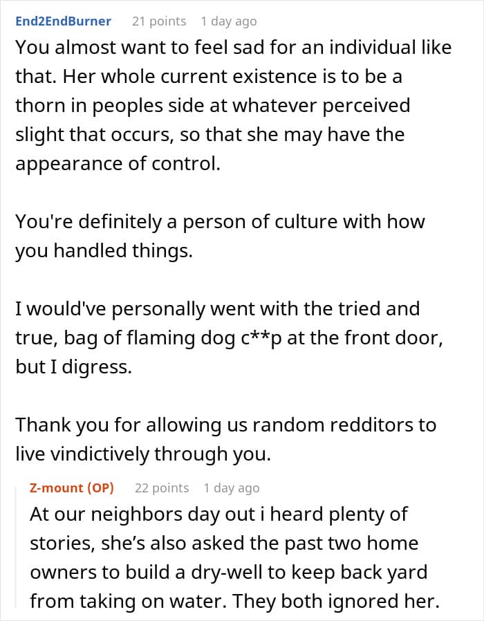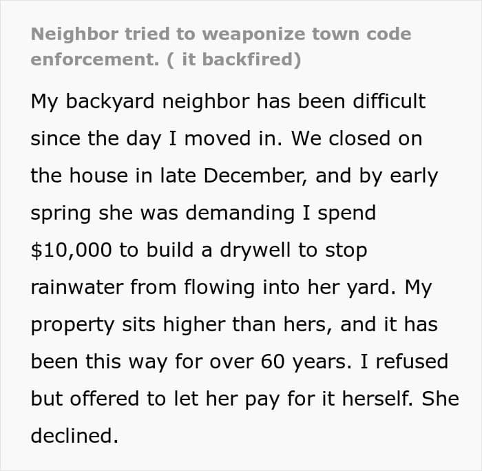 Although petty revenge sounds good in theory and makes for an entertaining story, the mature thing to do is often much more boring. Revenge might escalate the conflict further and drive the neighbor to even worse antics. When you think about it, that’s what happened to the lady in this story, didn’t it?