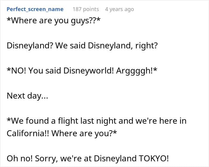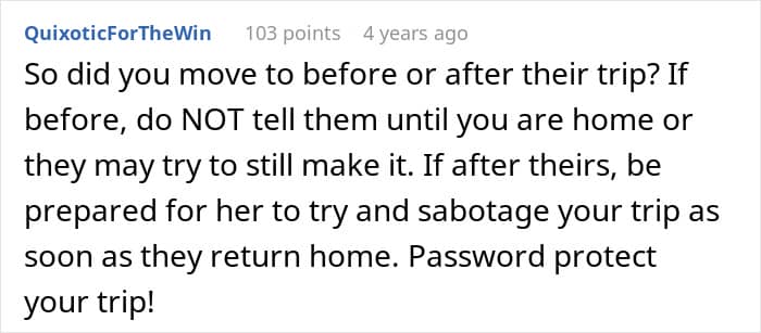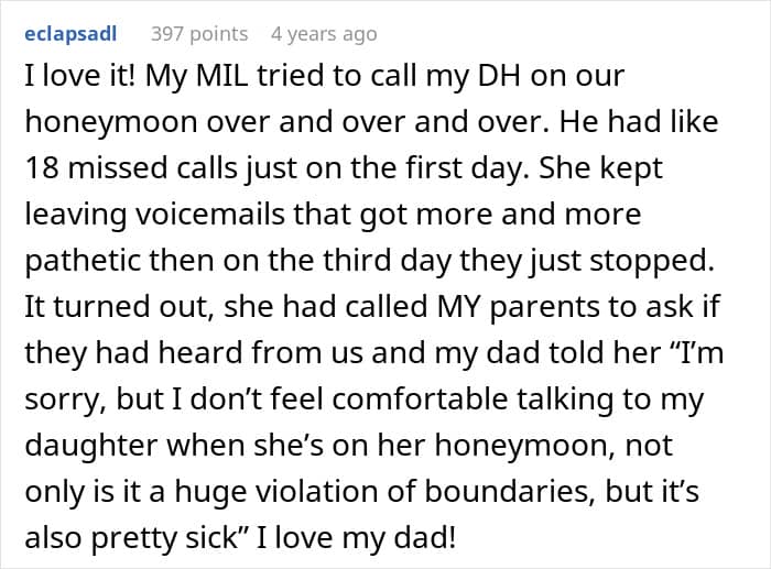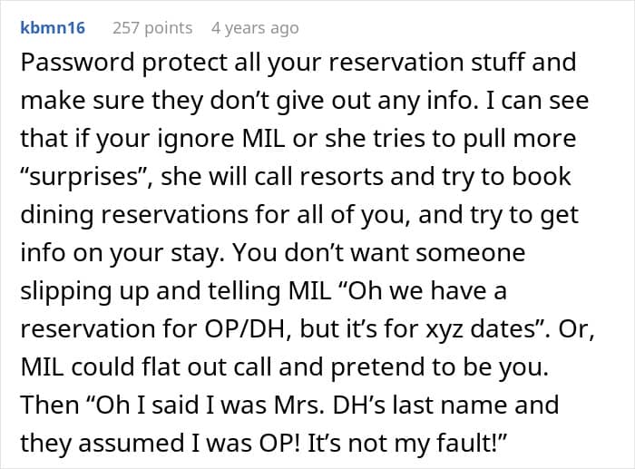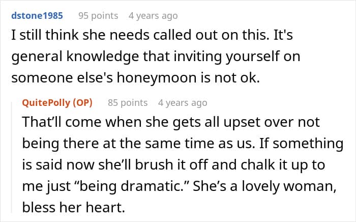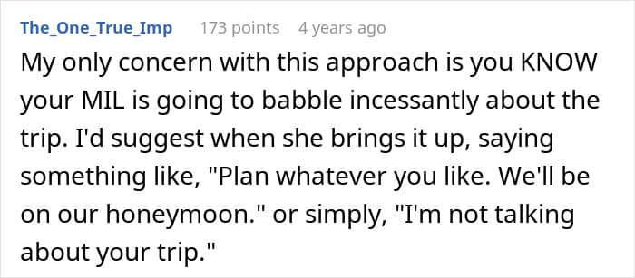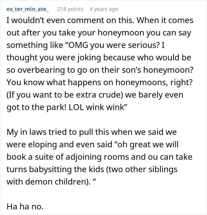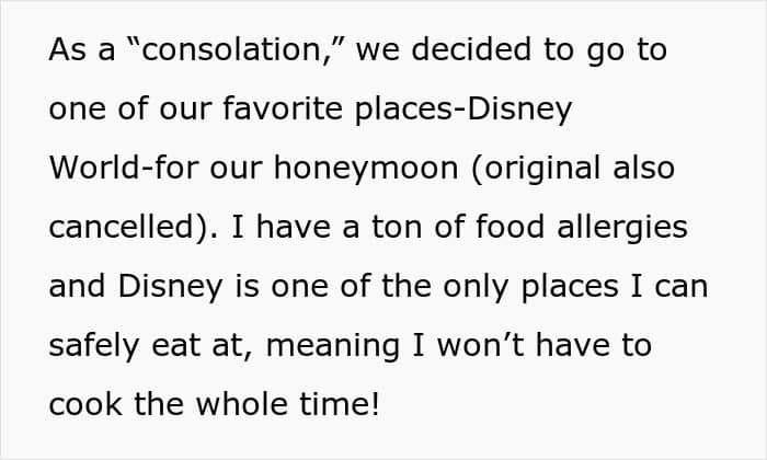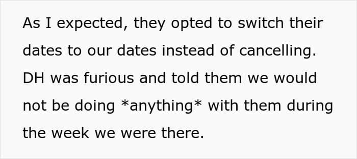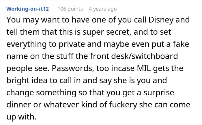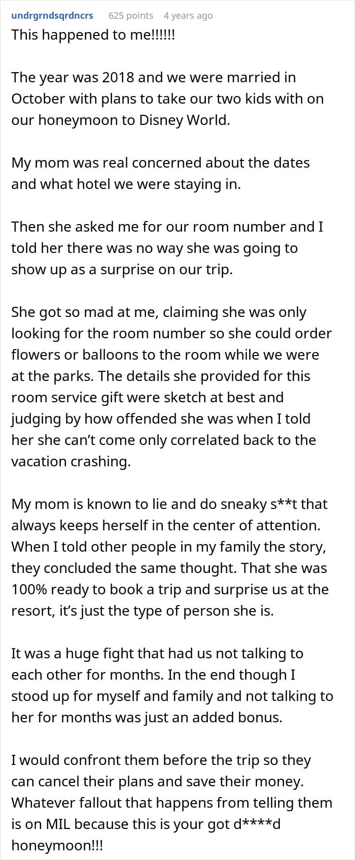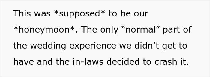 While it’s understandable that the happy couple rebooked their honeymoon tickets to avoid going to Disney World with their in-laws, this is still just a temporary solution. The main problem, namely, the in-laws (un)intentionally disrespecting their boundaries, will continue being an issue.