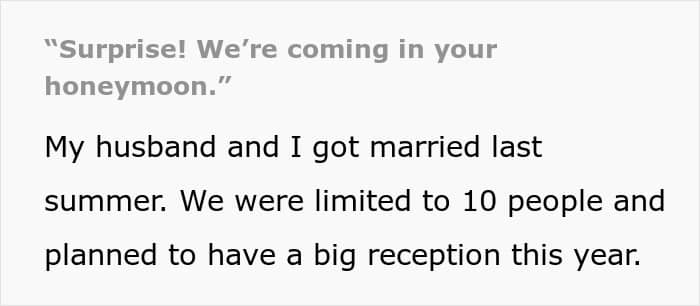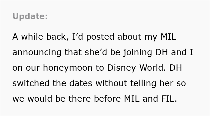 However, this woman’s in-laws suddenly decided that they’d be joining the couple’s honeymoon trip to Disney World, which wasn’t received well