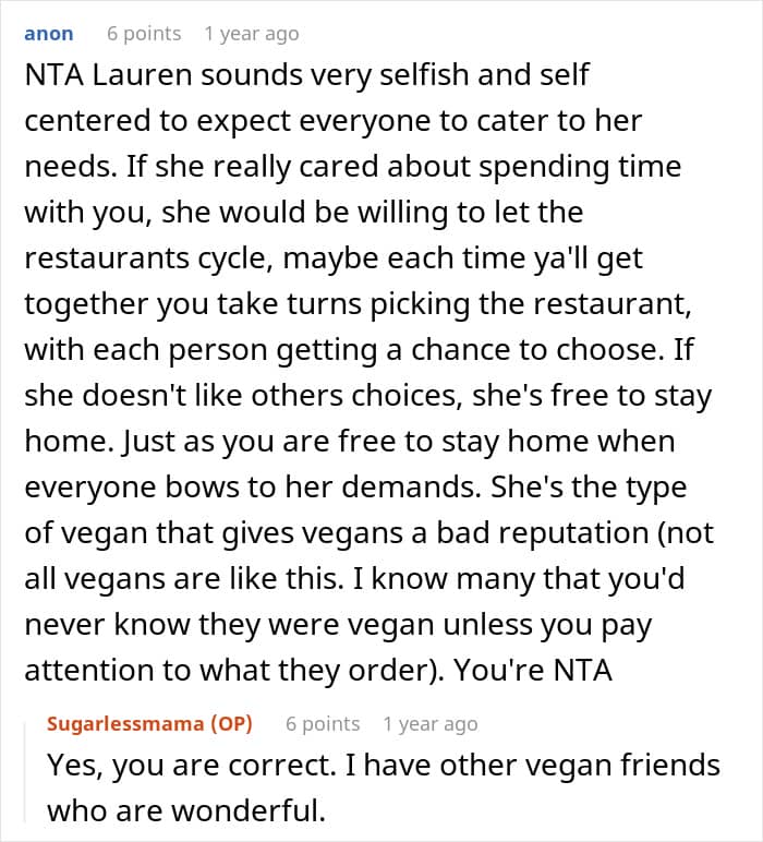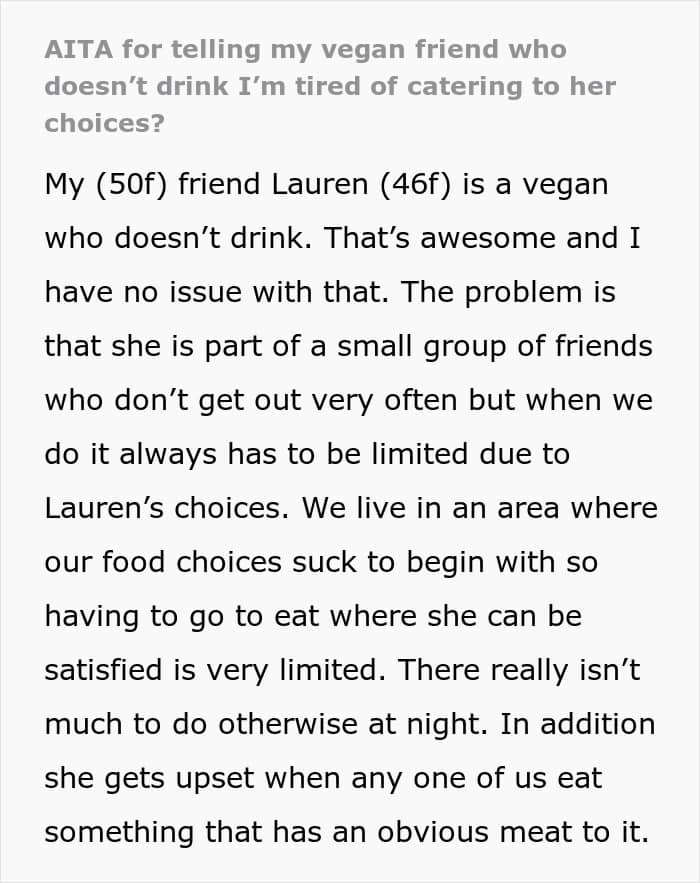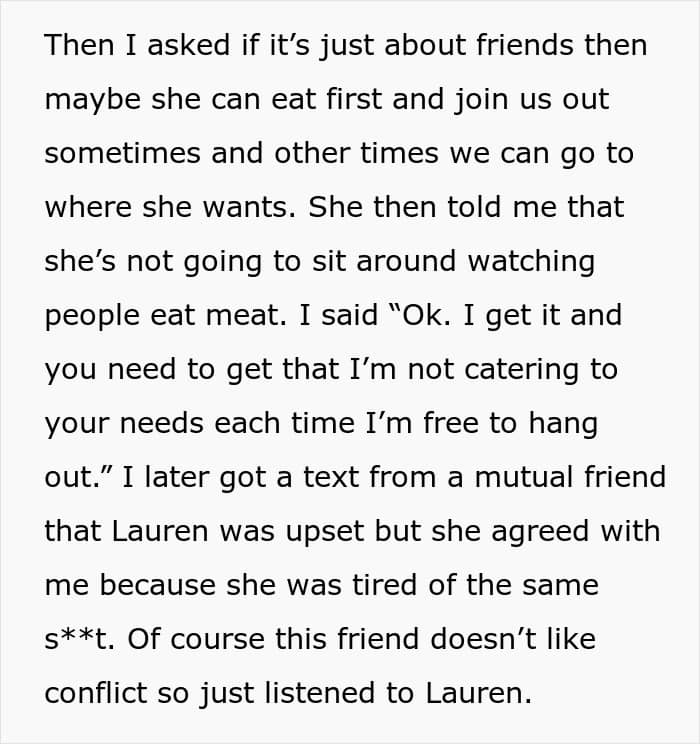 Some people still do it, unfortunately, like this woman named Lauren. Being a devout vegan, she would make her friends feel bad for eating meat. Everyone had already adjusted to her needs and wants, but it wasn’t enough for her.
