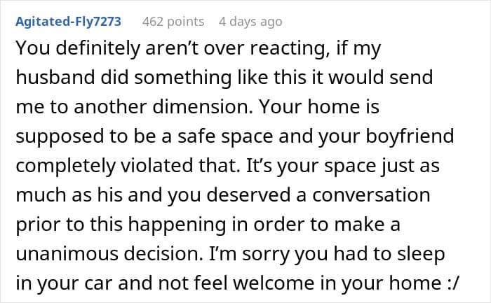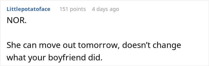 When the OP confronted her boyfriend, he insisted she was overreacting and claimed that if she wanted a future with him, he said, she’d need to accept that “family helps family”. She no longer felt safe or respected in her own home and emailed the landlord, gave her 30-day notice, packed a bag, and told her boyfriend she was done despite his accusation that she was forcing him to choose between her and his mother.