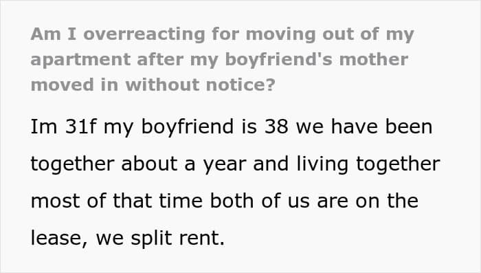The OP explained that she and her boyfriend had been together for about a year and were living together, both on the lease and splitting rent. However, one night, she came home exhausted to find boxes everywhere and unfamiliar shoes by the door. And then, sitting comfortably at the kitchen table was her boyfriend’s mother, who casually announced she’d be staying “for a while”.