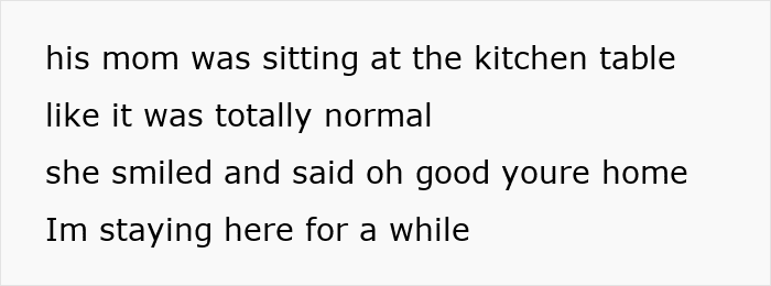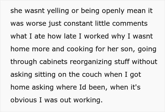 There had been no discussion, no warning, and no attempt to ask how she felt. Instead, the mother had already moved her belongings in and immediately began commenting on the home, including plans to reorganize the kitchen. Over time, the mother began making constant remarks about the OP’s work hours, eating habits, and how often she cooked for her son.