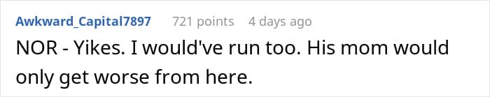 Netizens agreed that the OP was not overreacting, placing the blame squarely on her boyfriend rather than the situation itself. They called out his behavior as a major red flag, describing him as immature and overly attached to his mother. What do you think? Was leaving the apartment the right choice, or should she have tried to wait it out? We would love to know your thoughts!