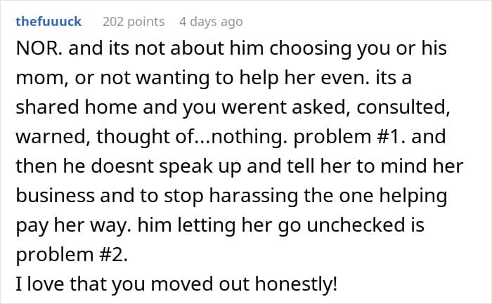 Netizens emphasized that the mother moving in was a violation of personal space and trust, stressing that a shared home requires shared decisions