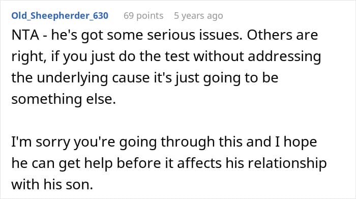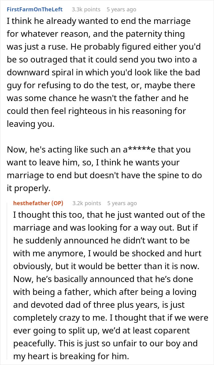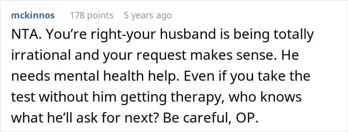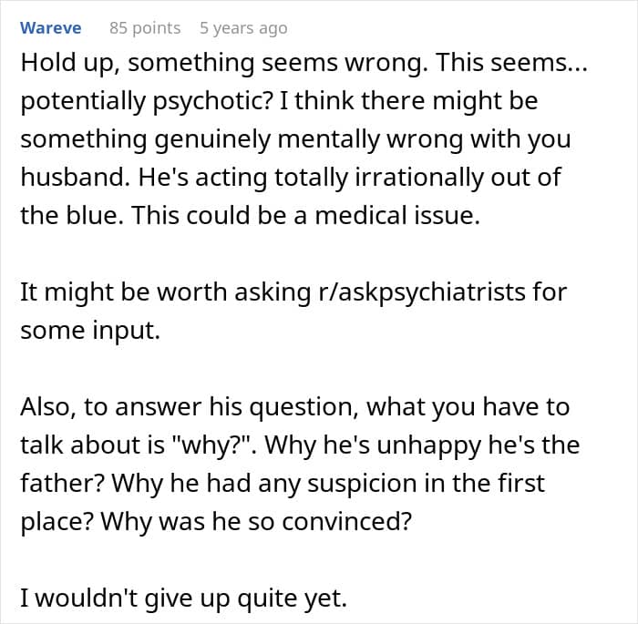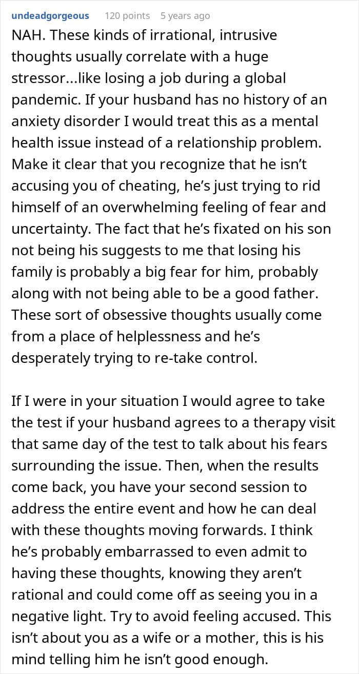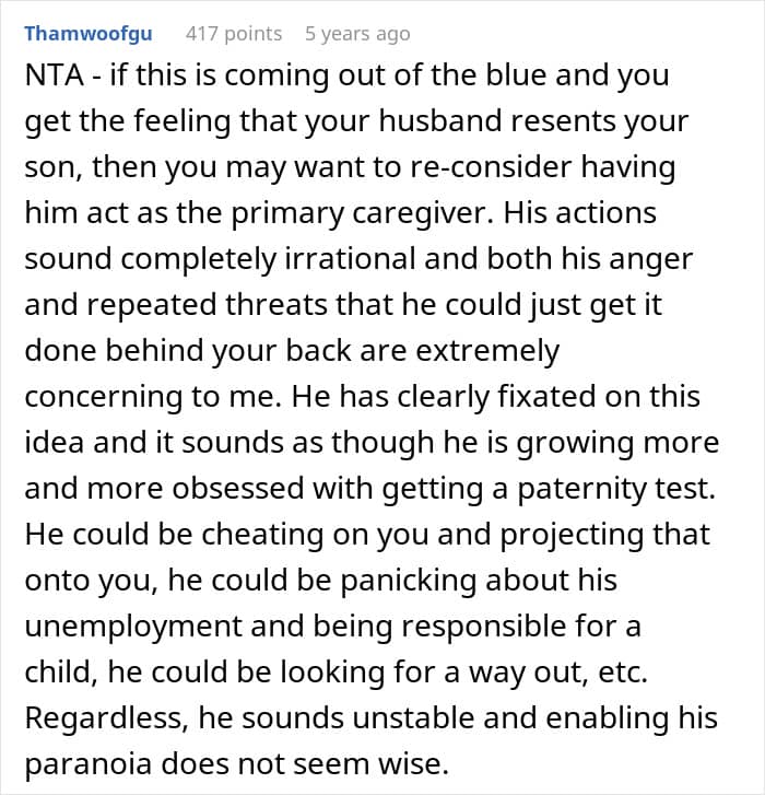 A woman asked the internet if she was wrong to tell her husband to get therapy before she’d allow a paternity test. Since losing his job, he’d become paranoid and anxious that their 3-year-old didn’t look enough like him. Later, she shared a sizable update on what happened next.