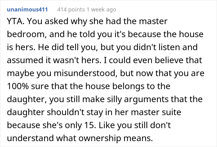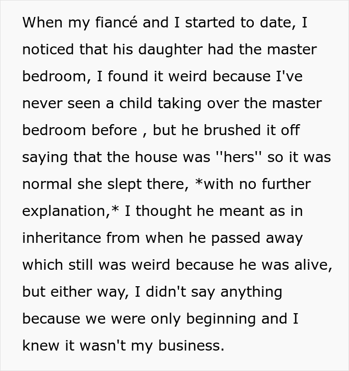 It should be clarified that at that time, the woman had a 6-year-old son, and her fiancé had a 15-year-old daughter from his first marriage. Her mother had passed away five years earlier, and since then, the girl has occupied the master bedroom in the house, which always surprised the OP. She somehow even asked the man about it, to which he replied – this is his daughter’s house, so she herself decides where to sleep.