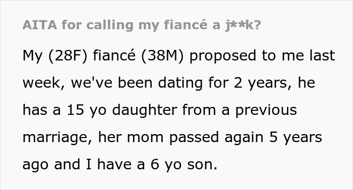 As, for instance, was the author of a thread in the AITA Reddit community. Her post received over 14K upvotes and almost 2K different comments so far. The 28-year-old woman was trying to figure out if she had done the right thing by quarreling with her 38-year-old fiancé.