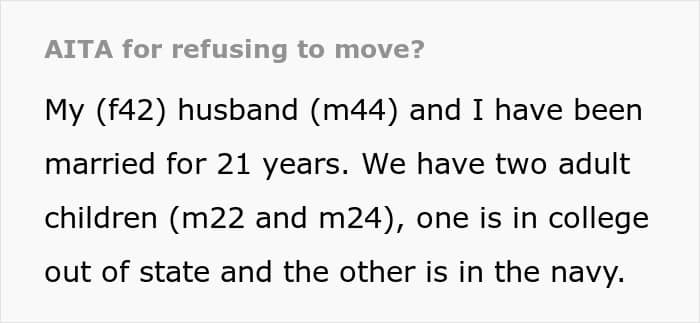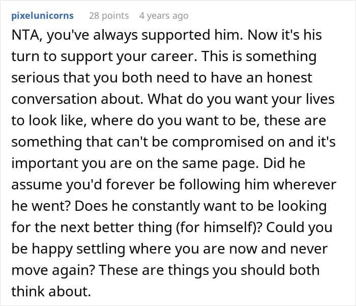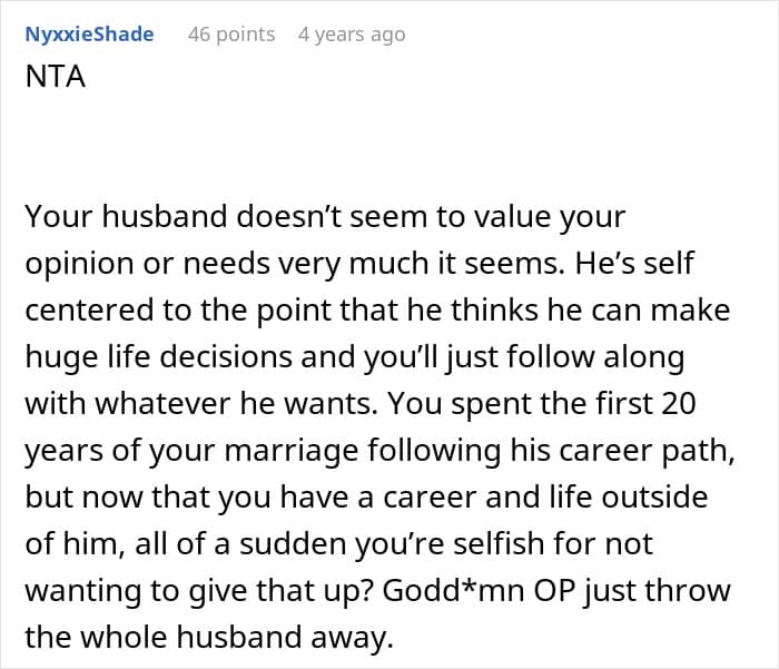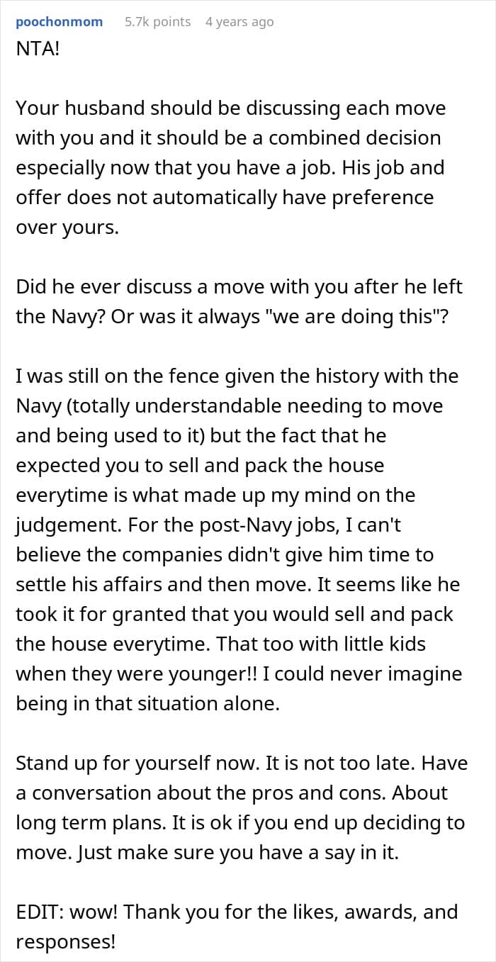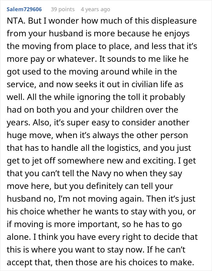 One stay-at-home mom says she’s prioritized her husband’s career for more than 2 decades, and has relocated so many times she’s lost count. For the first time in ages, she’s feeling settled and genuinely happy. She’s even started working, earning good money, and has made some new friends. Now, her husband wants to relocate yet again, but she has flat-out refused. He’s calling her selfish and she’s wondering if he’s right…