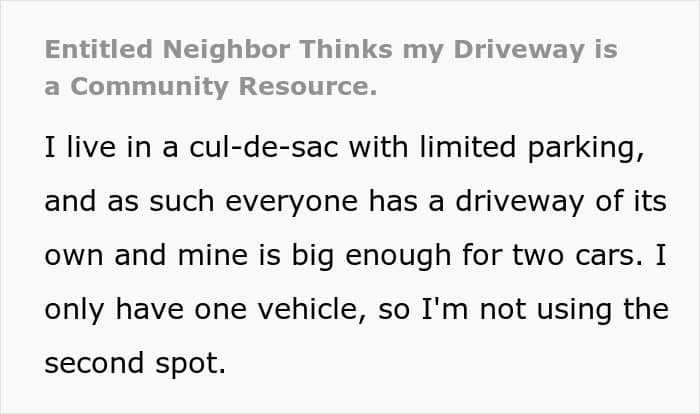 So, the Original Poster (OP) says that she lives in a cul-de-sac with limited parking. However, all the neighbors have their own driveways. The author’s driveway is so wide that even two cars can easily fit there. So it was precisely the free space that the OP quarreled with her neighbor over.