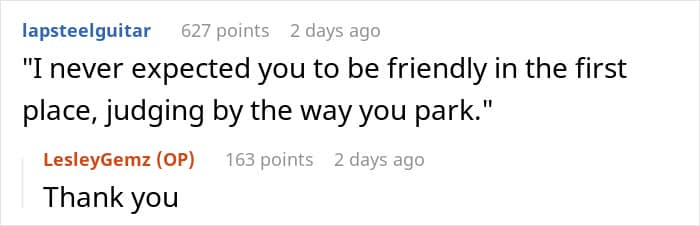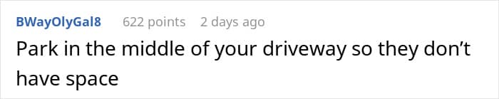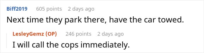 By the way, people in the comments also claimed that the original poster should’ve immediately called a towing company and left the entitled neighbor and her son to deal with the consequences. Responders also believe that the author could have parked her car in the center of her driveway or just diagonally. In any case, the opinion of the commenters is completely on the author’s side – and what about you, our dear readers?