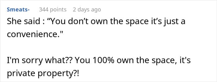 Considering that none of the neighbors had asked her for permission to park in the open space, our heroine walked over to the neighbor and asked to talk to her son so that he would stop doing it. But then the author faced an unpleasant surprise – the neighbor immediately made it clear that she considered the OP’s driveway a kind of community resource.