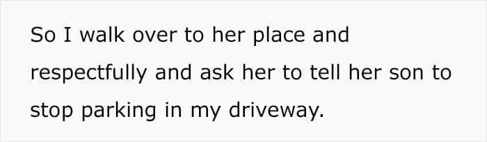 The author noticed that her neighbor’s 17-year-old son had left his car in her driveway overnight. At first, she thought it was just a one-off and said nothing – neither to him nor to his mom. However, night after night, the boy’s car ended up on the OP’s property. In short, the teen clearly began to consider her driveway his own dedicated spot…