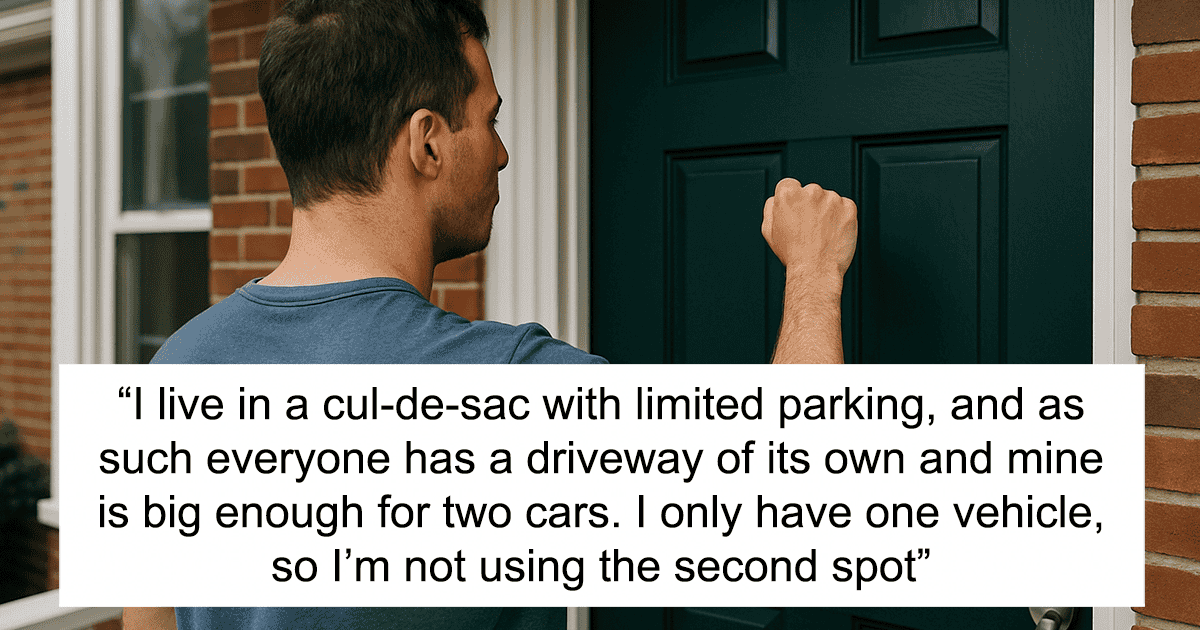 So, the Original Poster (OP) says that she lives in a cul-de-sac with limited parking. However, all the neighbors have their own driveways. The author’s driveway is so wide that even two cars can easily fit there. So it was precisely the free space that the OP quarreled with her neighbor over.