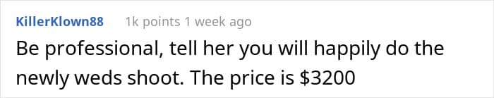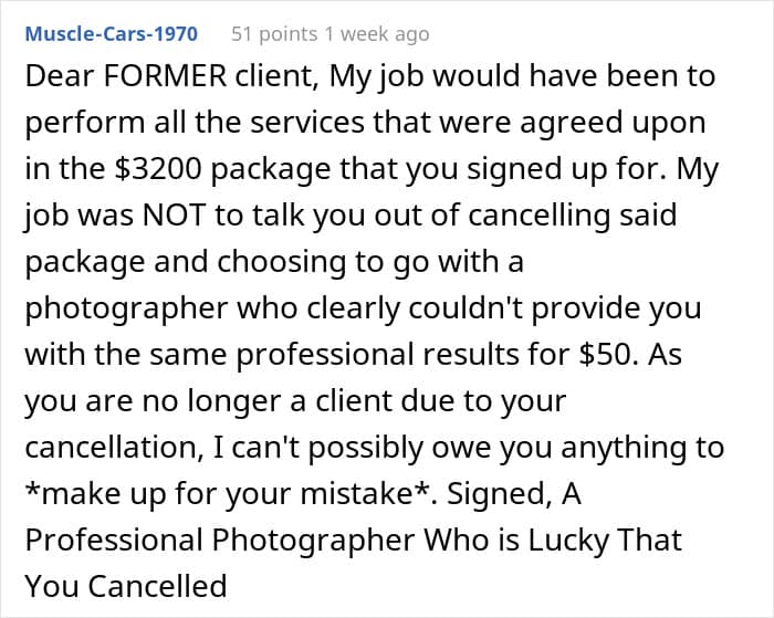 RELATED:A pro wedding photographer shared how the client canceled him for another photographer who only charged $50, but after receiving terrible photos, blamed him for not stopping her