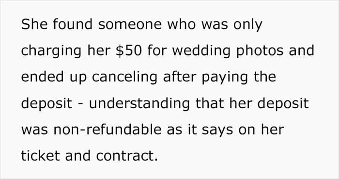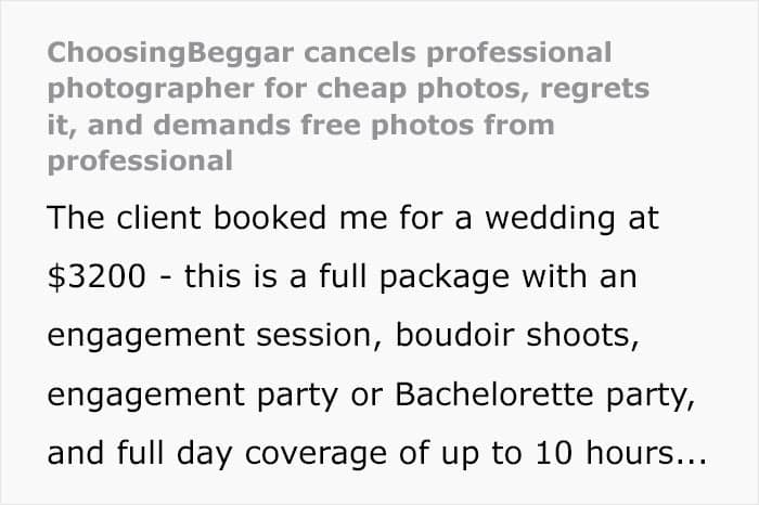 “The client booked me for a wedding at $3200 – this is a full package,” the Redditor u/cricoff shared a screenshot of a story on the Choosing Beggars subreddit. The post said that the bride then found someone else who was only charging $50 for wedding photos, so she ended up canceling the professional and losing her deposit.