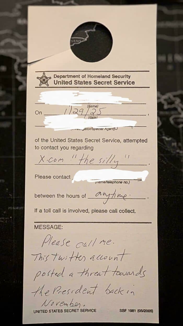 Today I heard someone knock on my front door about 2PM, but I couldn’t answer as I was stuck in a meeting. I checked my security camera and saw two gentlemen at the door about 30-50yr old id guess (I figured they were selling some kind of home improvement service like new windows, etc… About two hours after they left I went outside for something and found this note from “United States Secret Service” hanging on my doorknob asking me to call a number to talk to an agent about a twitter account that apparently “posted a threat towards the president back in November”.