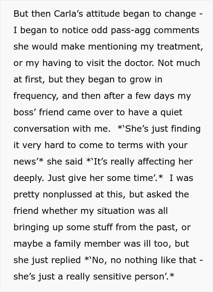 She started with passive-aggressive comments about the OP’s doctor visits. Then, her friend approached the OP, you know, the guy battling a life-threatening illness, to explain that Carla was really struggling to come to terms with the news. Wait, what? The OP was the one going through chemo, but somehow Carla was making it all about her.