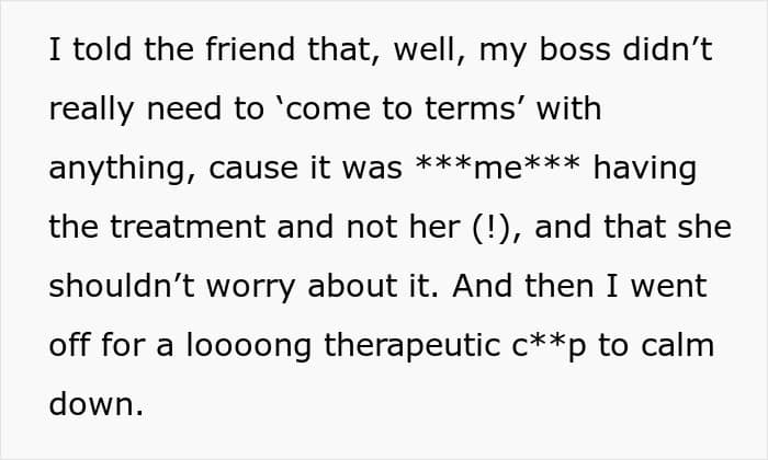 The boss starts making passive-aggressive comments about the man’s treatment and even says that she’s having a hard time dealing with the news of his illness