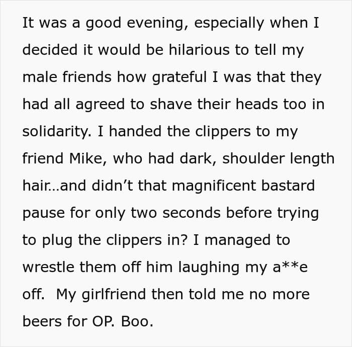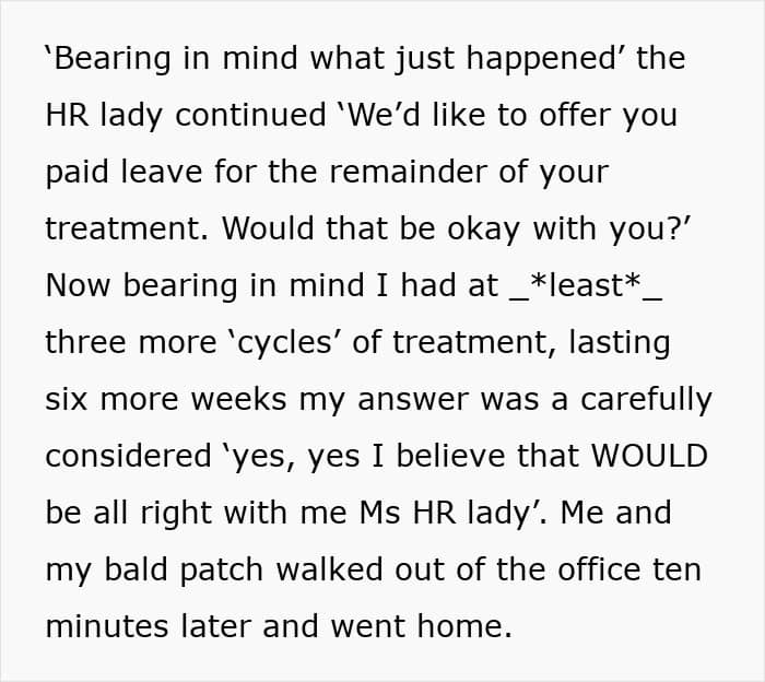 But our OP made sure she learned her lesson.With paid leave in hand and a new job lined up, the OP focused on healing. He even threw a head-shaving party with friends, beers, and curry, turning a tough experience into a bonding moment. As for the treatment, it went well, and he’s been in remission ever since. Victory!