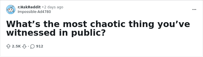 Normally, chaos is reserved for the big screen (or little screen, in the age of short form videos) but every now and then real life has its moments. So someone asked “What’s the most chaotic thing you’ve witnessed in public?” and people shared their most unhinged examples.
