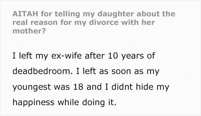 The man had a meeting with his daughter and explained the reasons that led him to divorce, including lack of intimacy with her mom