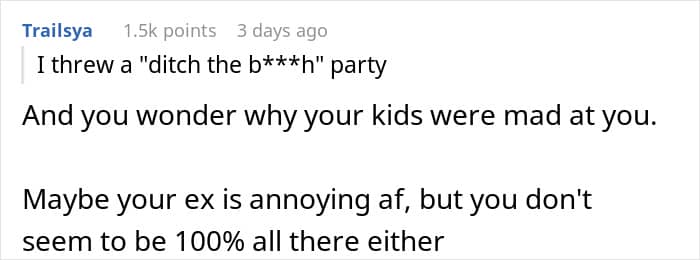 After this, the OP got divorced and even, as he admits, threw a ‘ditch the b**ch’ party. The man considers this decision one of the best in his life, but his now adult children do not share their father’s happiness, and even stopped communicating with him. Especially after he got a new girlfriend.
