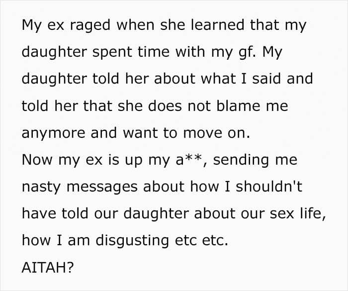Well, after that, as the OP says, the girl changed her anger to mercy, started acting civil with her dad’s GF, gradually came around to her, and even spent time with them on New Year’s Eve. However, the author’s ex, having learned about everything, snapped at him, livid at what he told the children about their sex life. The woman called the OP ‘disgusting,’ and he himself did not think that he’d done anything reprehensible.